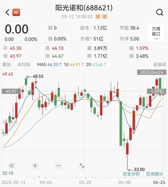 截至4月24日收盘,阳光诺和报45.97元/股,总市值为51亿元。